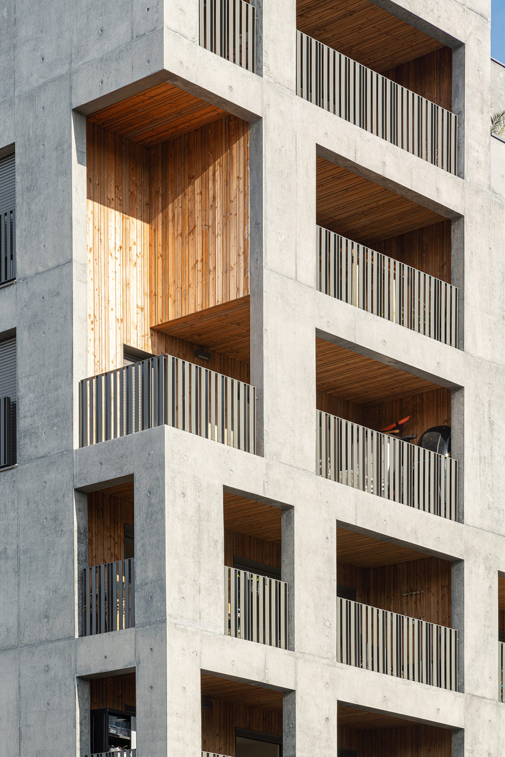 Un travail fin a été effectué sur la perforation des enveloppes qui s’accompagne de l’expression d’une autre matérialité à l’intérieur des loggias.