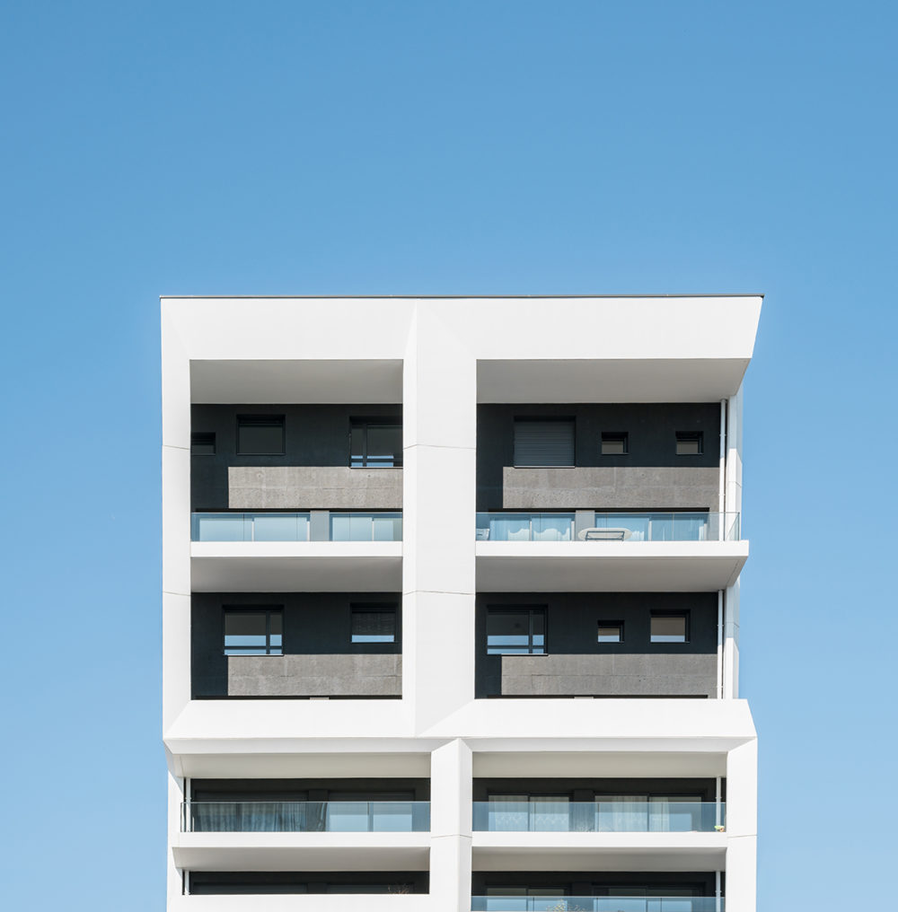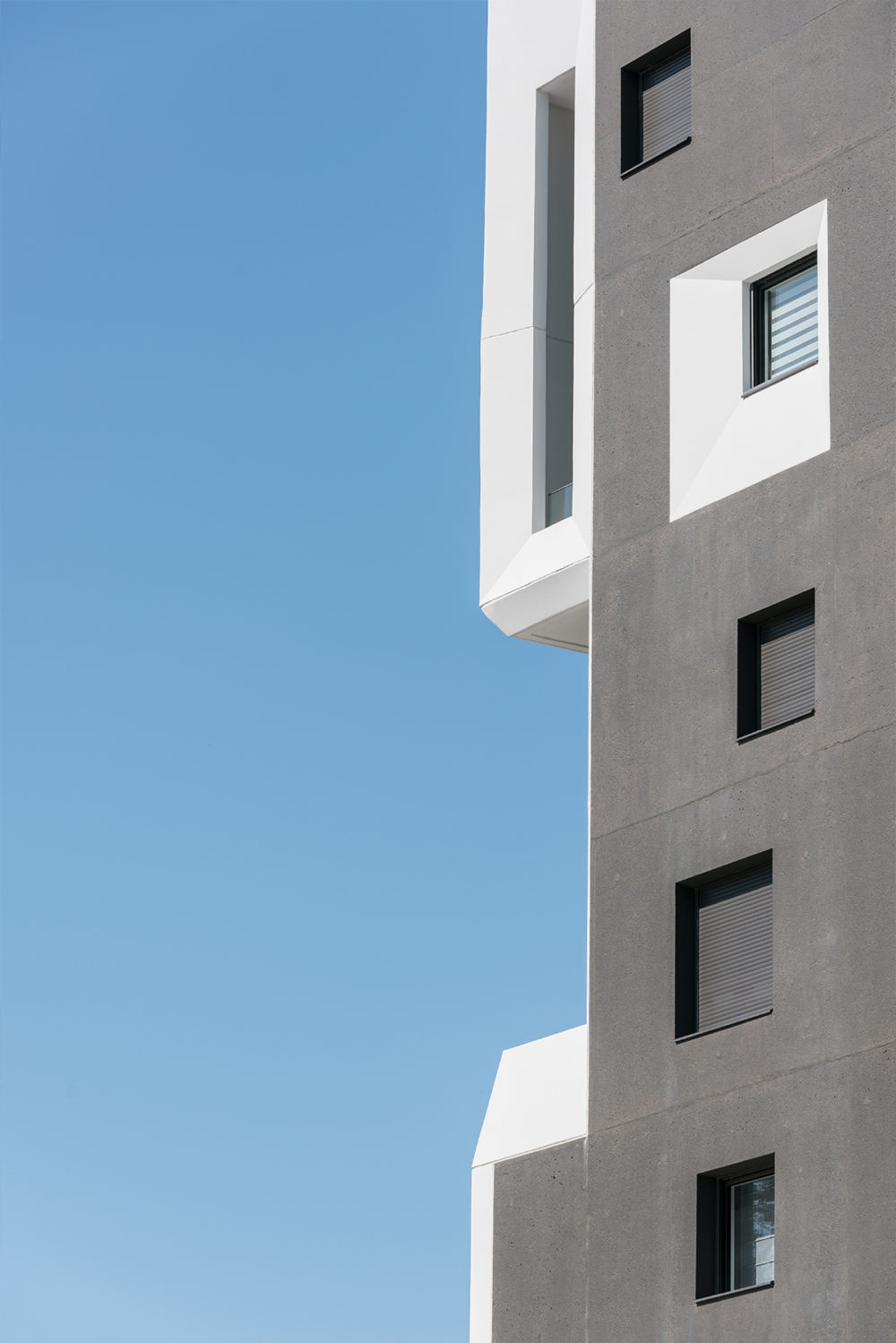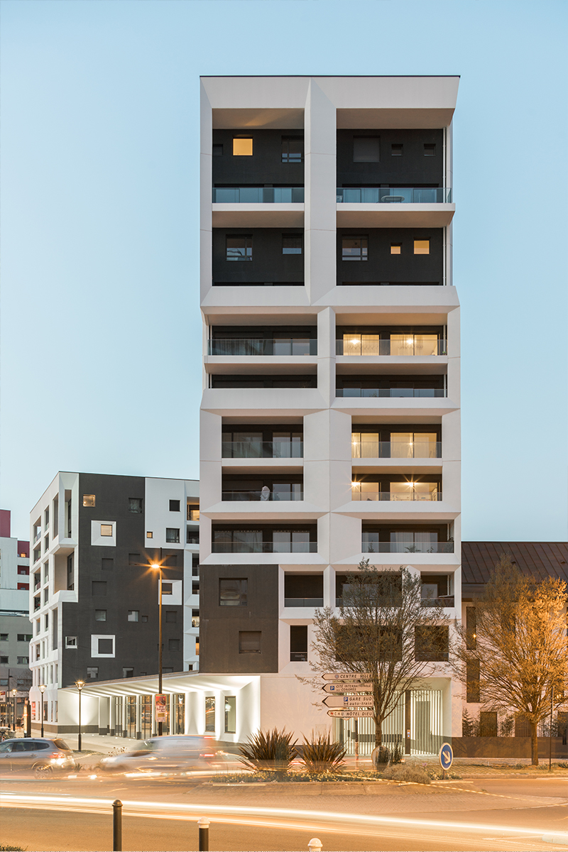 L’architecture des bâtiments décline deux matérialités : le béton peint en blanc et le béton sablé lasuré.