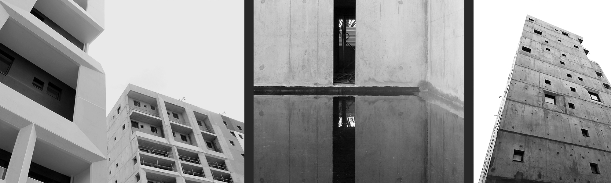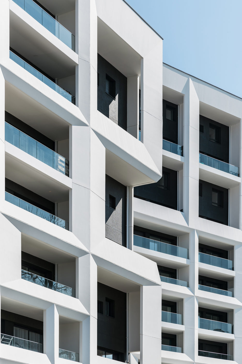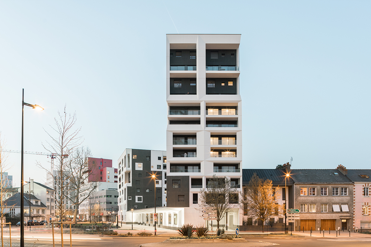 L’architecture des bâtiments décline deux matérialités : le béton peint en blanc et le béton sablé lasuré.