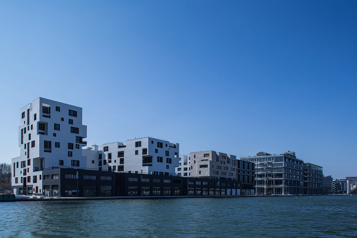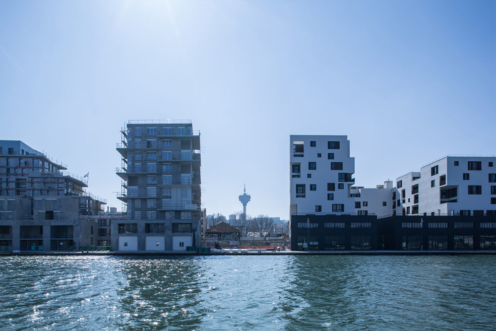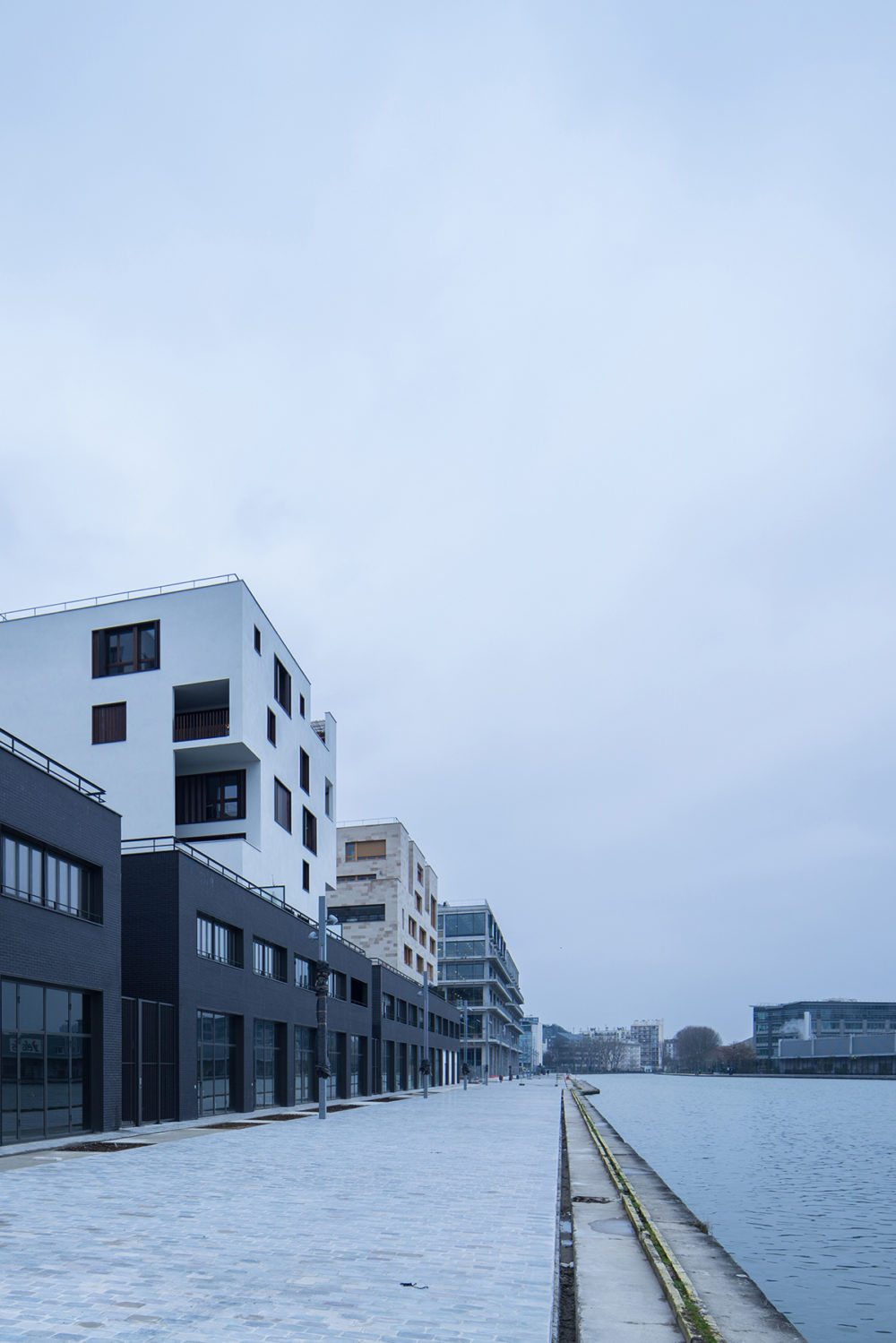 Une volumétrie suffisamment fragmentée pour établir un dialogue fructueux avec le tissu urbain. Orienter très largement le projet sur le paysage exceptionnel du bassin du Port. Introduire un jeu de décalages estompant les vis-à-vis et permettant d’introduire les vues diagonales.